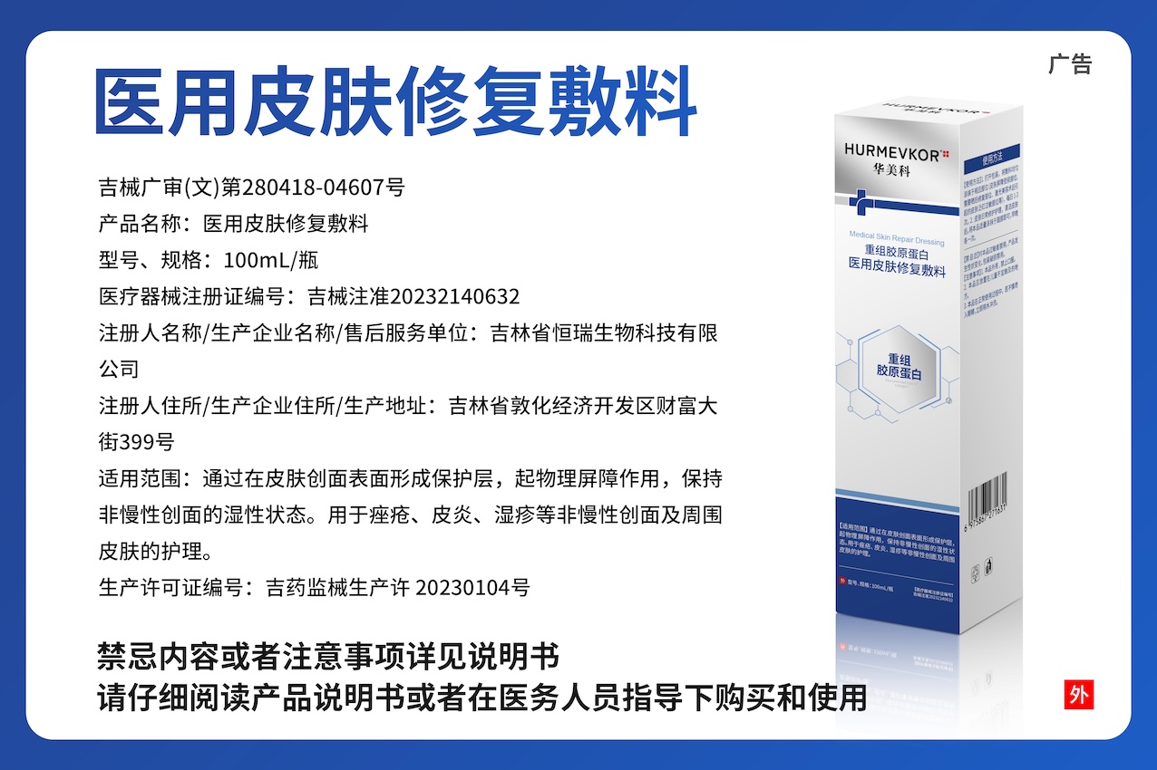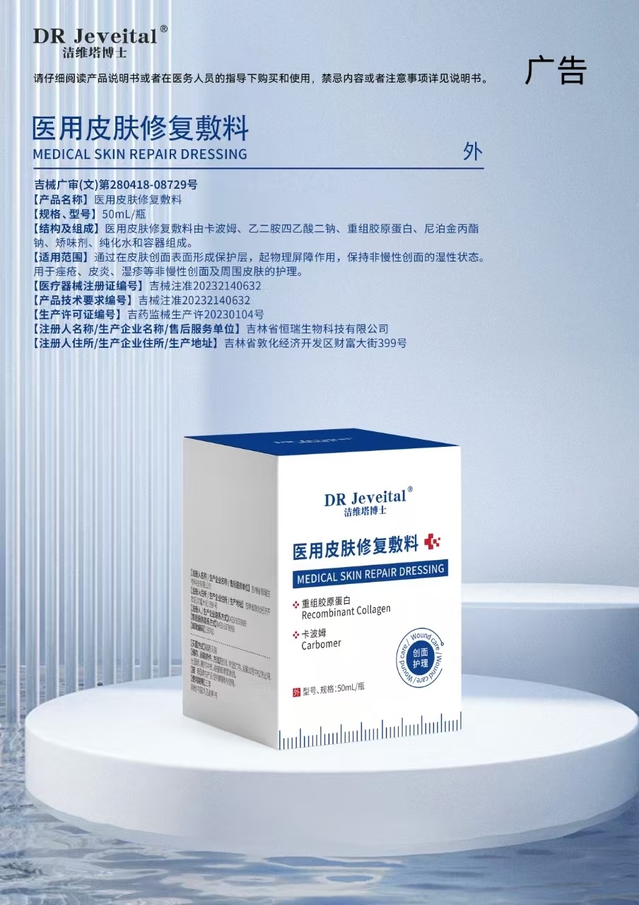 【结构及组成】医用皮肤修复敷料由卡波姆、乙二胺四乙酸二钠、重组胶原蛋白、尼泊金丙酯钠、矫味剂、纯化水和容器组成。